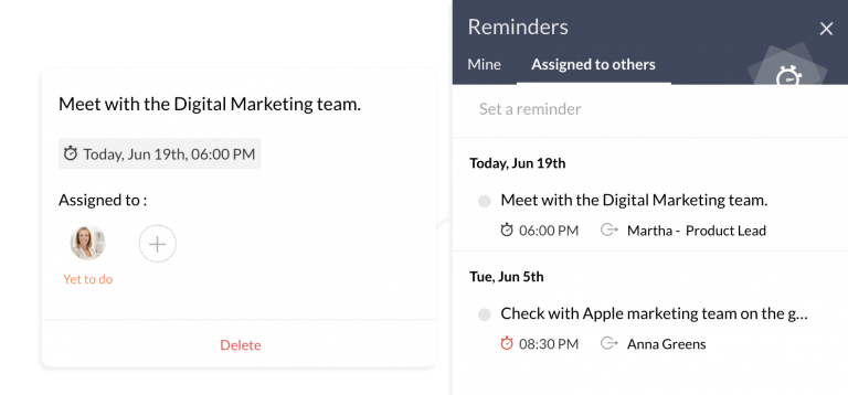 您是否遇到过这样的情况:在会议上讨论了几个方案,可是会后却忘记了落实。借助Cliq全新的提醒功能,您可以为即将发生的活动、项目和任务设置个人及团队提醒。 Cliq会向您发送提醒通知,防止错过日程安排。