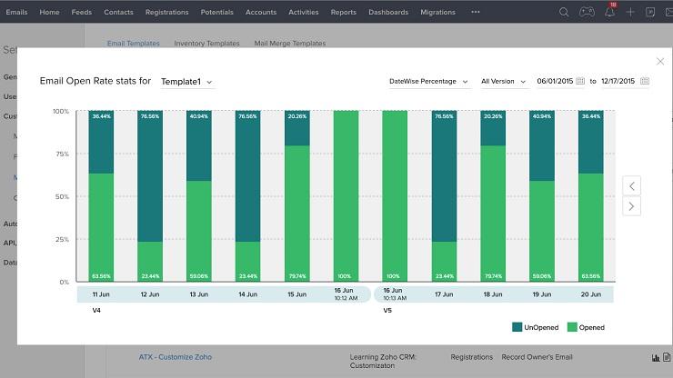 Zoho CRM中的电子邮件管理和营销很简单,然而通过推出与Salesinbox的集成,Zoho进行了一次重大改革,为销售人员提供新的专用邮件客户端。 SalesInbox通过与模板分析,版本比较和开放率等新的可用指标相比增加了更多的电子邮件组织。SalesInbox通常被用于同步客户状态和销售人员的任务,并使其集中在一个应用程序中操作。它还允许用户从电子邮件中添加新的潜在客户或联系人记录,并在传入电子邮件触发预设的规则时自动将任务分配给销售代表。用户可以在SalesInbox中设置提醒,提醒自己在特定时间范围内发送或回复电子邮件。