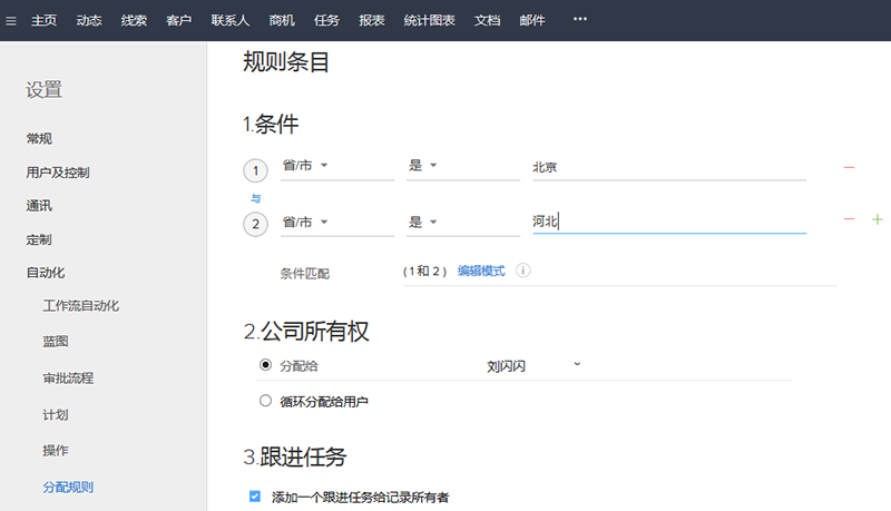 选择要针对哪个模块里的数据进行分配。这里我们选择“线索”,就是收集来的未经跟进的潜在客户信息。然后输入规则名称,设置规则条目。此例中,我们让凡是潜在客户所在省市是北京或者河北的,都自动分配给销售员闪闪。