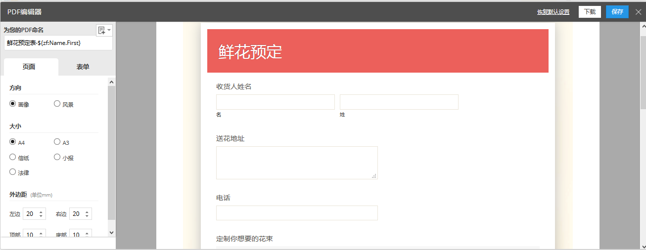 首先,在Zoho Forms里通过拖拽字段来快速设计好你的表单。 然后对这个表单设置一个PDF版本。点击表单设置->PDF设置->自定义。 根据表单性质选择不同的自定义选项。比如订单、选修课申请表、销售合同等表格在横排竖排、大小、页边距等方面是不一样的。而对于问卷调查之类的表格,可以在PDF里不显示那些用户没有作答的问题,会显得整体比较干净整洁。