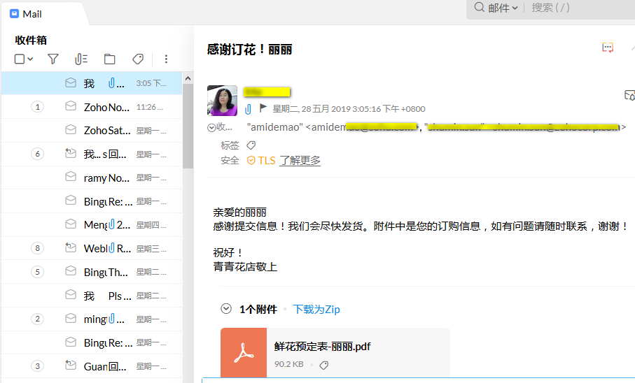 这就OK啦!当有人通过你的表格提交了信息后,Zoho Forms就会自动发送这个邮件模板给她/他。效果是这样的: