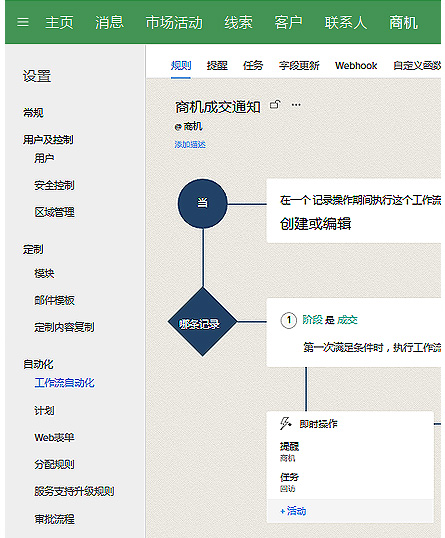 • 关联活动(任务)到工作流规则,当创建或修改销售、市场、支持或订单相关的记录时,为用户自动创建相关任务