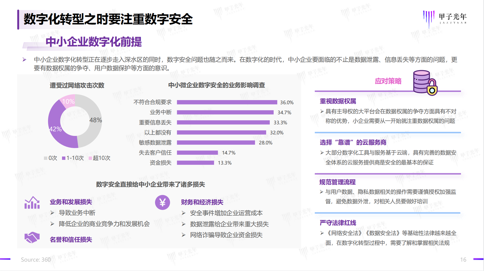 报告指出:“中小企业数字化转型正在逐步走入深水区的同时,数字安全问题也随之而来。在数字化的时代,中小企业要面临的不止是数据泄露、信息丢失等方面的问题,更 要有数据权属的争夺、用户数据保护等方面的意识。”