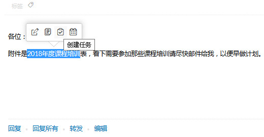 在当前邮件内容中,选择一段与任务相关的文字,Zoho Mail会自动弹出几个图标选项,选择第三个,“创建任务”,然后填写任务名称、提醒方式和时间,保存即可。如图:
