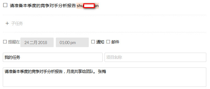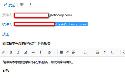 只需写一封邮件,收件人地址那里,@符号前面加个+task ,邮件标题写成任务名称,邮件正文内容写成任务描述,点击发送即可。如图: