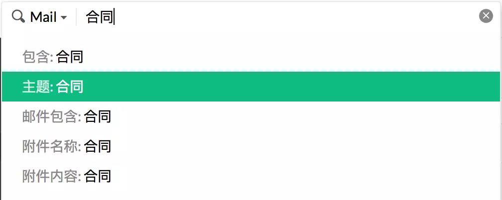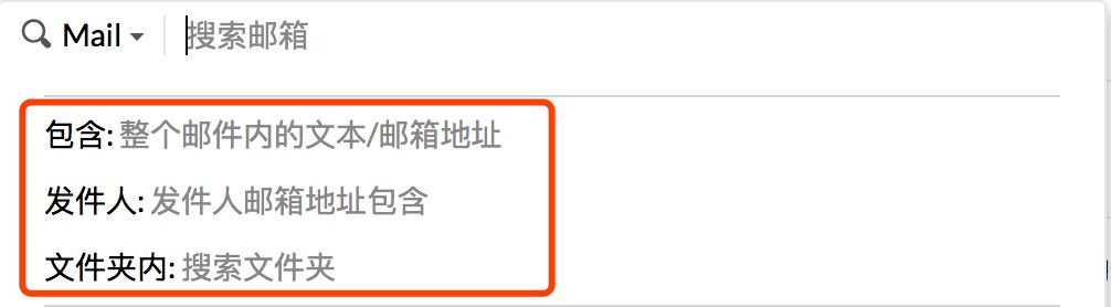 以前, 除了要在搜索框中输入搜索词之外, 您还需要使用鼠标从 "高级搜索" 菜单中选择对邮件的哪个部分进行搜索。而现在,在您开始输入搜索词时,系统就会自动给出建议, 只需用键盘上的上下箭头选择一个部分便可立即搜索。