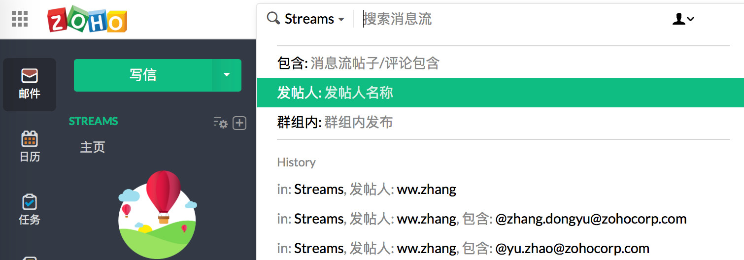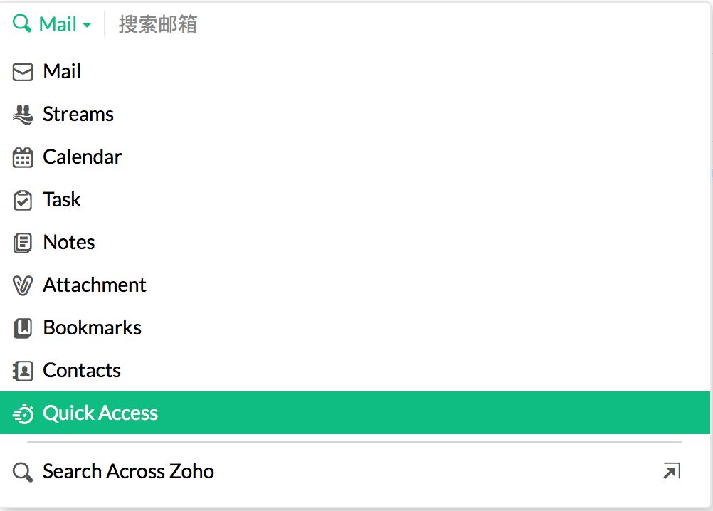 Zoho Mail帐户包括邮件、消息流、日历、便笺、任务、书签和联系人。现在可以对所有这些应用程序里的内容进行搜索。而对于每个应用程序也都有专门的搜索过滤器, 用于更细化的搜索。例如:您可以根据任务所有者来搜索任务,或在日历中根据位置来搜索活动或会议。