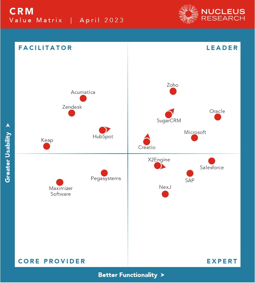 本次CRM技术价值矩阵,Nucleus Research坚持了过往的研究方法,基于对终端用户的体验,从可用性和功能性进行衡量,将满足要求的厂商分别划分到Leaders、Experts、Facilitators和Core Providers四个象限中,表明其解决方案的市场地位,帮助用户评估并做出回报率更高的选择。
