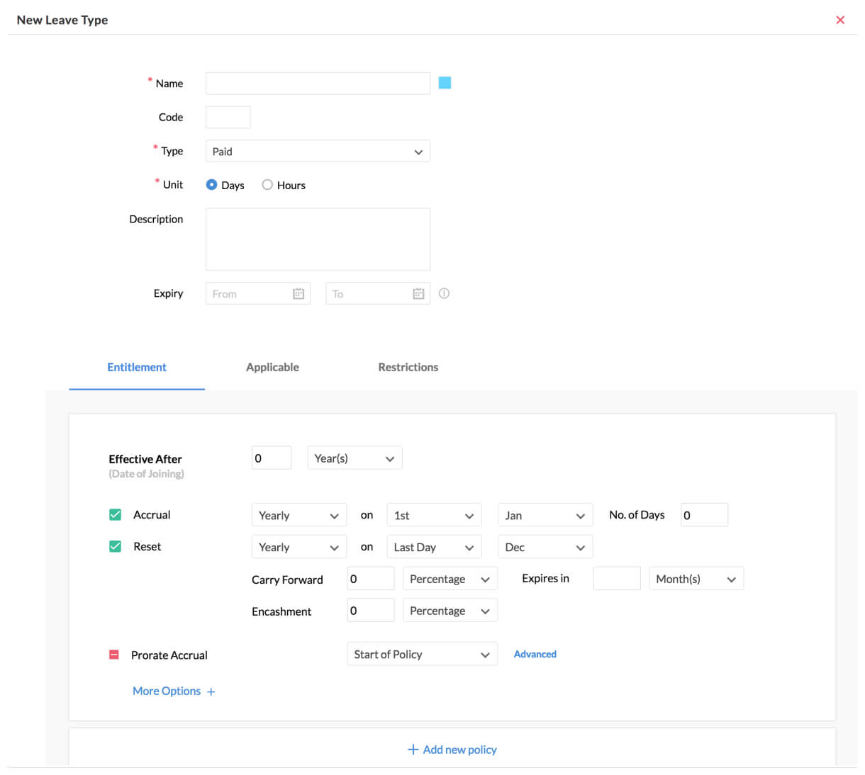 Zoho People新版中,改进了休假管理政策的自定义功能。比如,可以设置年假结余自动转至下一年、休假包含周末、允许休假的每日小时数等。