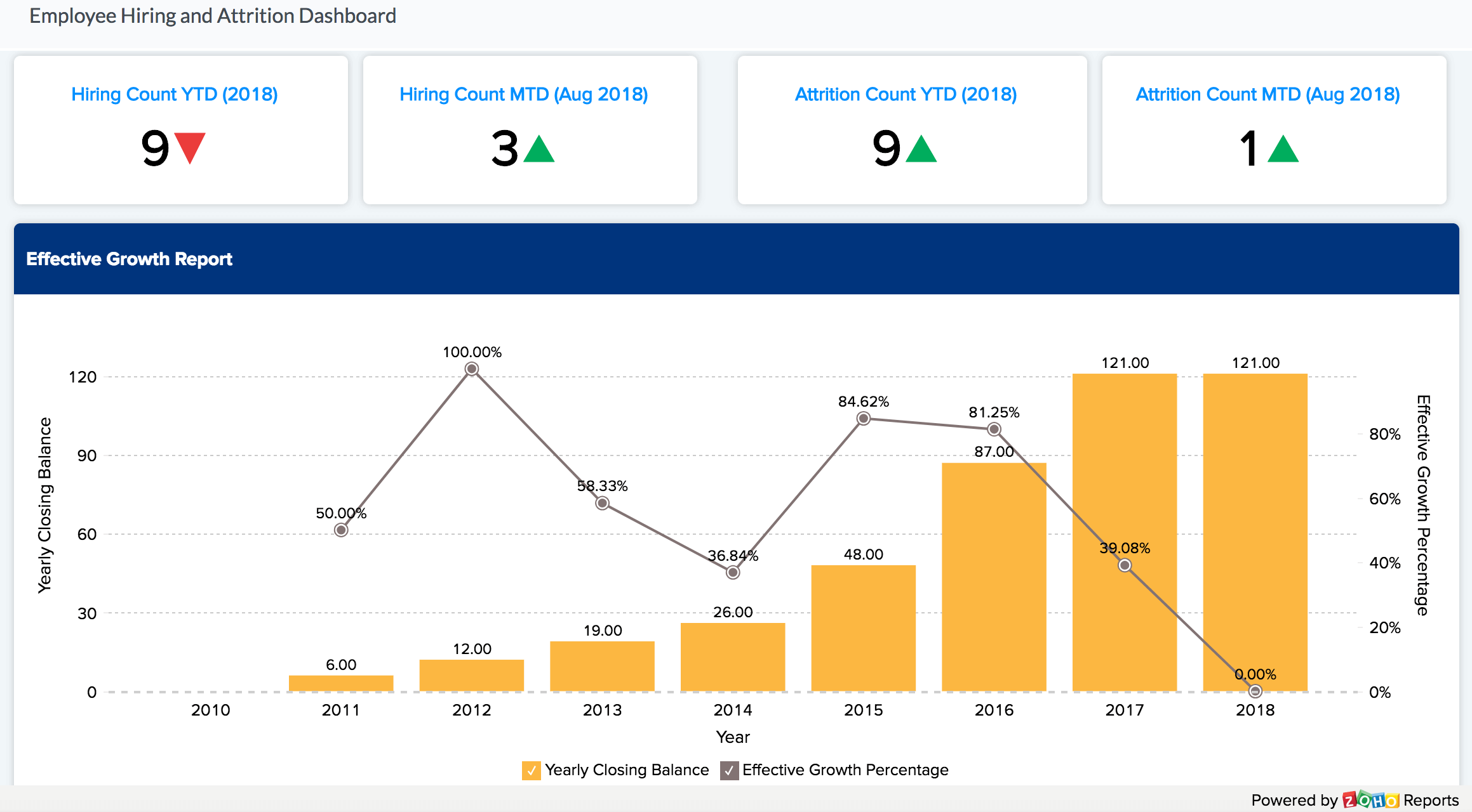 Zoho People可自动生成查询表等多维图表,对机构数据进行高级分析,也可共享给他人。 而报表仪表板可让HR从主页集中查看关键报表的概要。