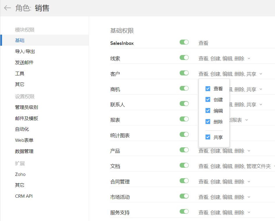 Zoho CRM里的权限管理功能很细致,无需额外定制,即可满足企业对单条客户数据、整个模块客户数据的精细操作管理需求。