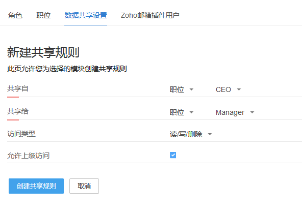 默认情况下,Zoho CRM里客户数据的访问权限为私有,只允许该条客户数据所有者及其上级领导可以查看。但是,使用数据共享规则,您可以将数据访问权限延伸到其他职位及组用户;数据共享规则设置之后,属于指定职位及组的用户将获取访问其他用户数据的权限。