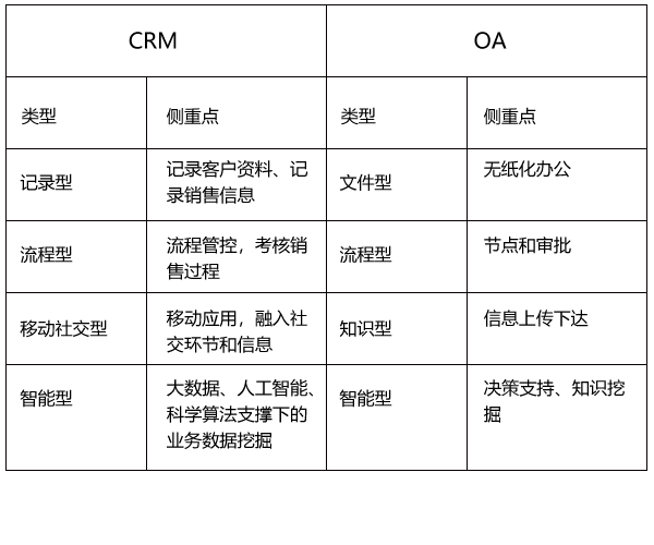 在演变的过程中,无论是CRM还是OA ,在不同的阶段形成了不同的类型,放在一起对比会对两者的区别理解更深入。