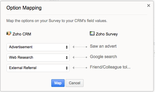 上例的问卷中,可能有个问题是,“您从哪里知道我们产品的?”以前答案可能是“广告”、“推荐”,很不人性化。更新后,答案可以是“我看过你们的一个广告”,或“我的朋友/同事向我推荐的”,但同步到CRM后,会自动映射成“广告”、“推荐”。这就保持了CRM报表的简洁性。