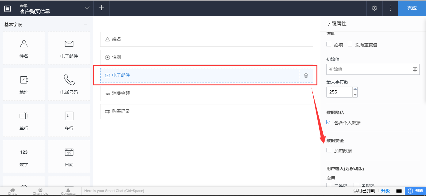 1.打开表单构建器,从右侧的字段属性中,勾选“加密数据”。