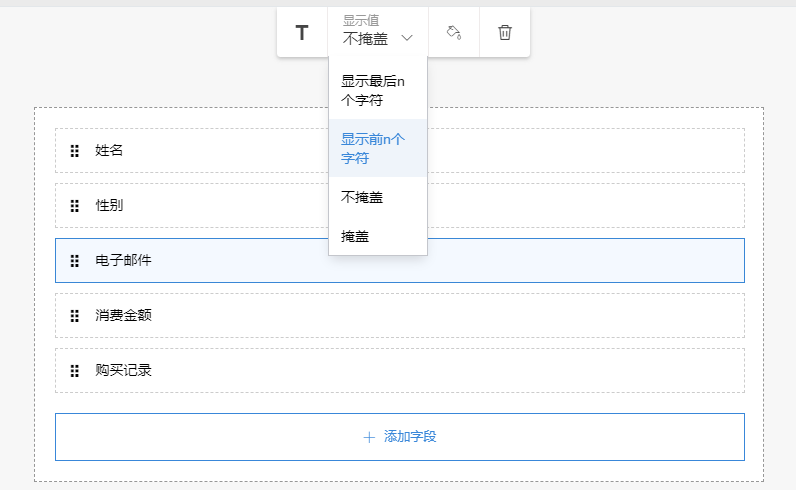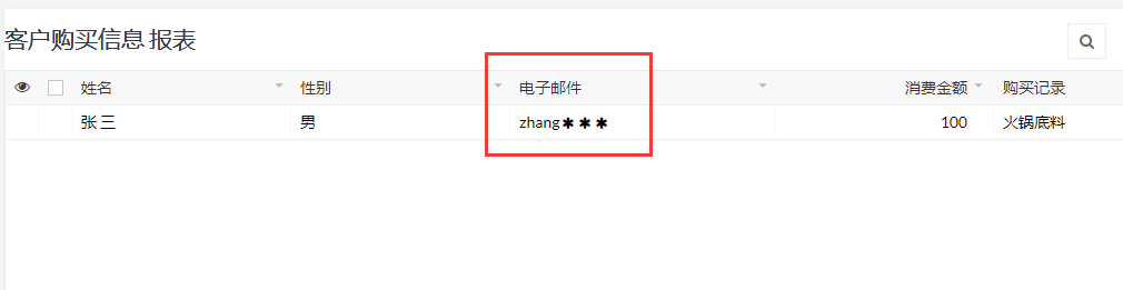 我们以屏蔽邮箱地址为例。 想象一下,您已经通过Zoho Creator搭建了一个包含客户购买数据的应用程序,这里边包括了他们的姓名、性别、电子邮箱、购买记录、消费金额等数据信息。此时,您需要与您的营销顾问共享这份数据,以便更好的了解客户的偏好。但是,又不想将客户的联系方式给到营销顾问,那此时,数据屏蔽就可以起作用了。