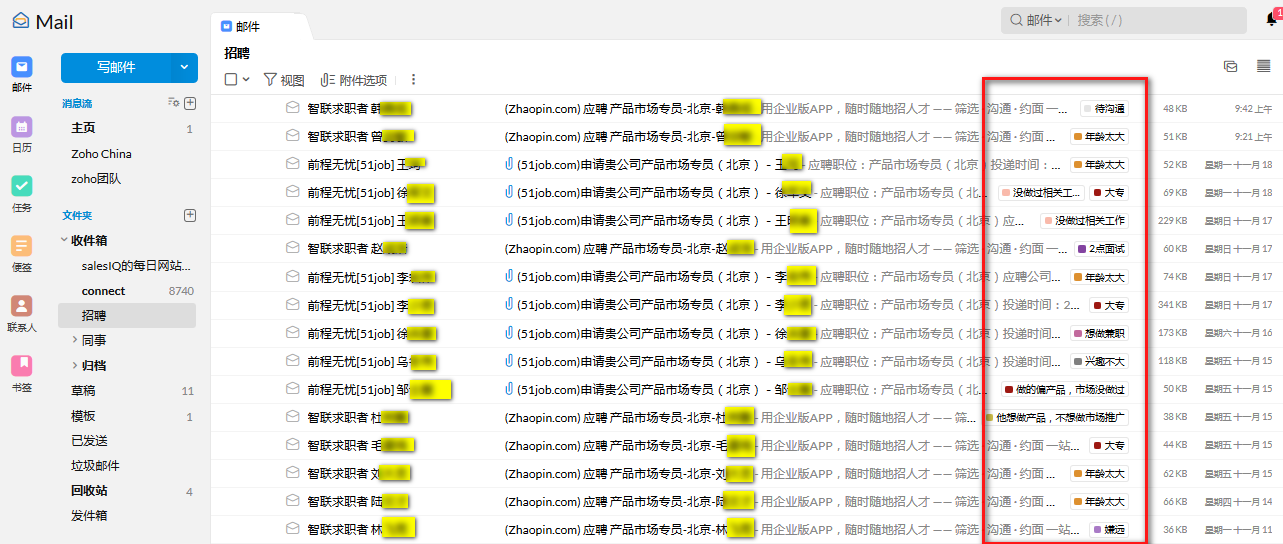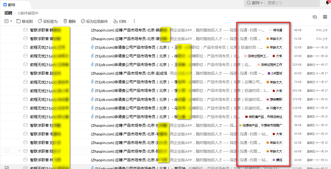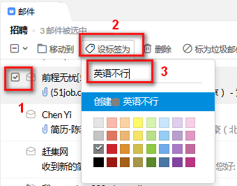 3.点击“招聘”文件夹,挨个查看简历,把面试后的情况简要添加为邮件标签。方法是勾选要加标签的邮件—》点击上方的“设标签为”,输入你的面试感受,要简短,然后回车即可。这是新建标签,也可以从已有的标签里选择。