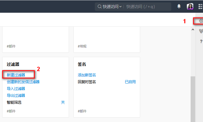 2.新建一个过滤器,把所有投来的简历都自动汇总到“招聘”文件夹里。点击邮箱界面右侧那个小齿轮,它是设置,然后点击“新建过滤器”。