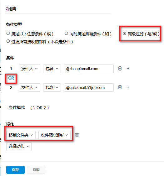 注意要选择高级过滤,因为可以选择“或”或者“与”的条件。这里我设置的条件是当发件人的邮箱地址里含有招聘网或51job网站的邮箱后缀的时候,操作是自动把这类邮件放到“招聘”文件夹里。“动作”那里你可以选择比如自动标记为已读、自动同时转发到某个邮箱做备份等等。我没选。