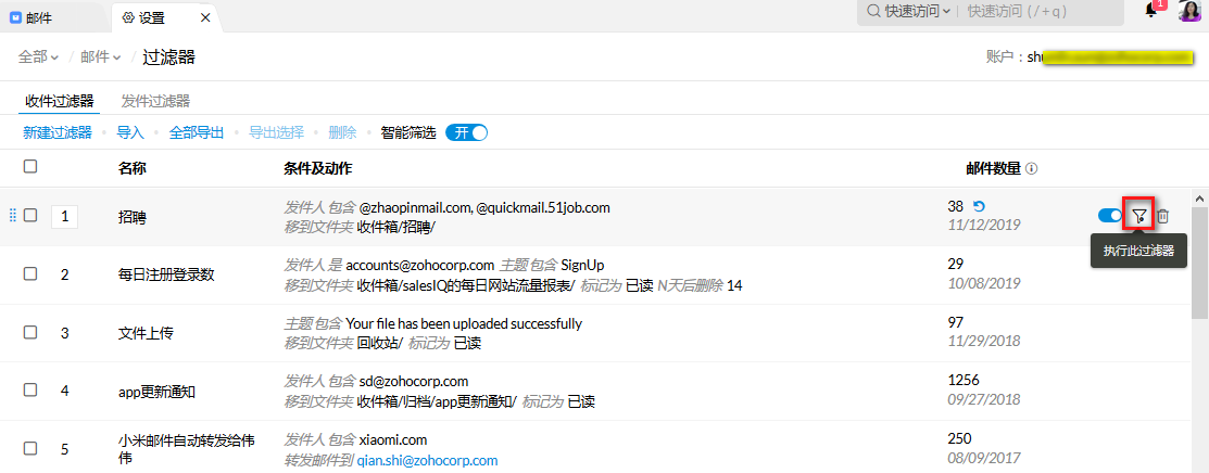 这个过滤器建好后,如果你收件箱里已经有这种简历了,那么你需要点击一下这个“执行过滤器”按钮,它就会把你之前收到的简历自动拖到“招聘”文件夹里。如果还没收到这种简历就不用点,等收到的时候它会自动拖过去的。