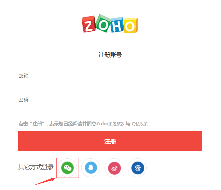登陆Zoho官方网站www.zoho.com.cn,点击立即注册,注册页面点击微信图标: