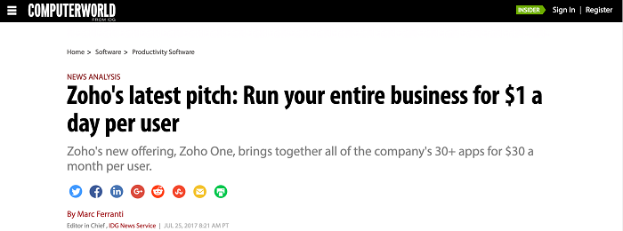 Zoho推出了Zoho One,包括超过35款在线软件,每用户每年只需1800元。---此文翻译自ComputerWorld的一篇报道。