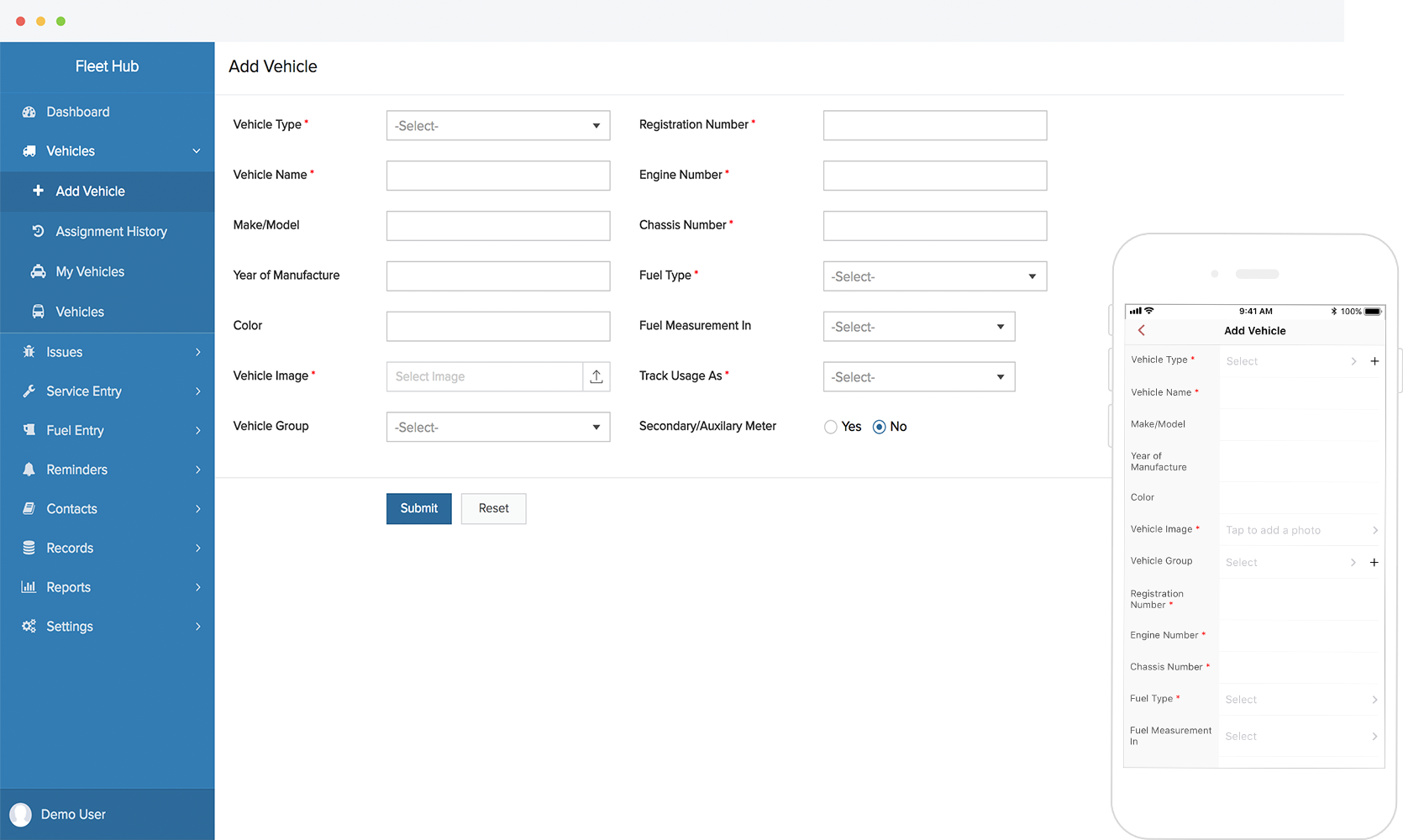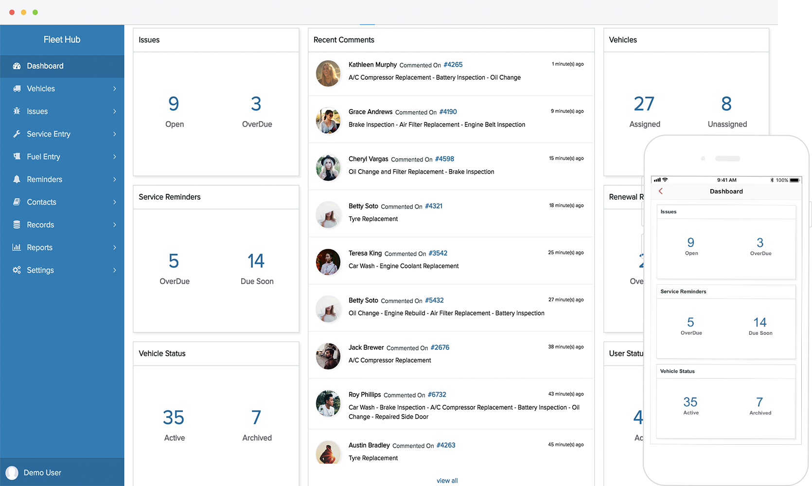 在一处记录有关您的现场资产的详细信息,包括技术规格、保养历史记录、燃油日志和驾驶员分配。