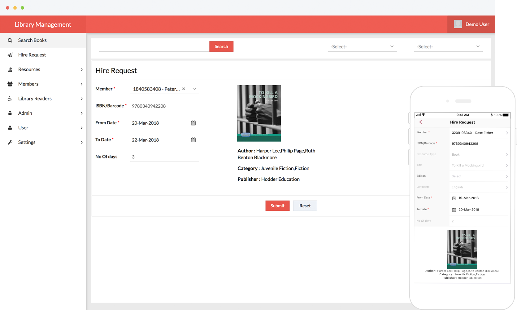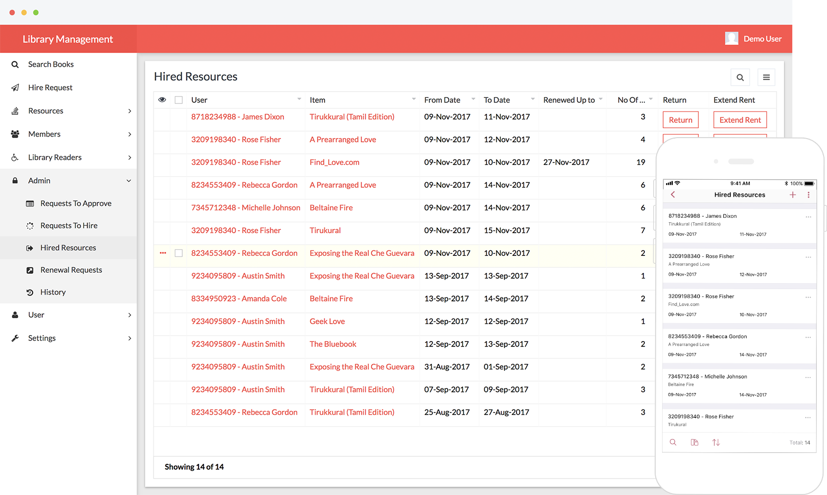 会员可通过应用申请新书借阅或续借服务。所有请求将按类型(新借/续借)记录至个人报表。管理员可根据书籍可用状态,一键审批或拒绝相关请求。