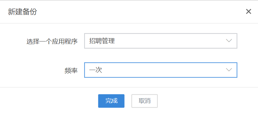 - 在“新建备份”对话框中,选择要备份的应用程序及所需备份频率。备份将按所设置的频率进行。点击完成。