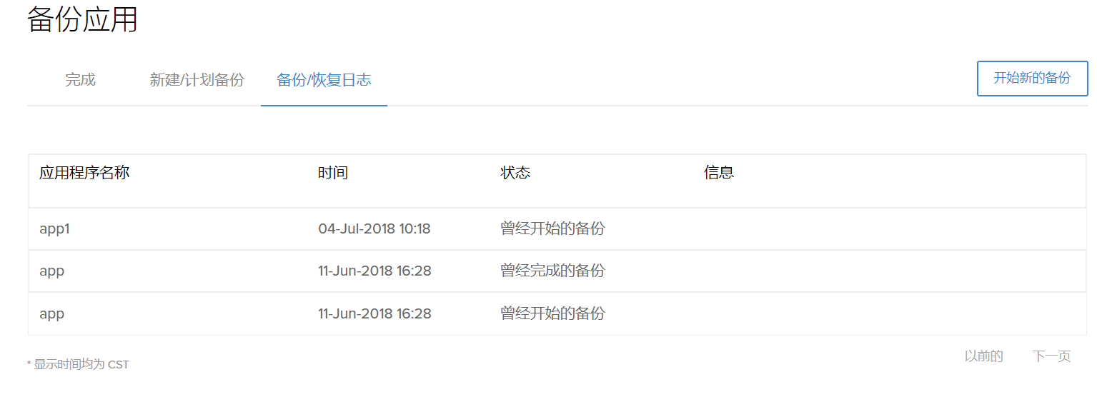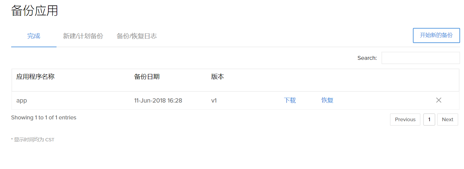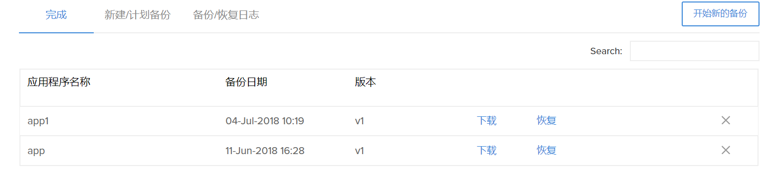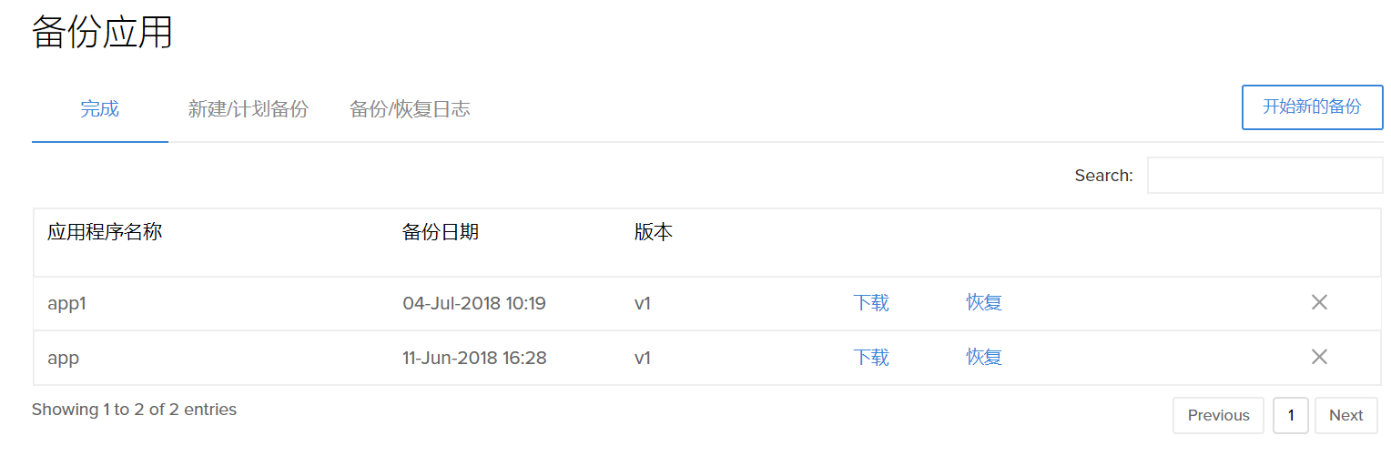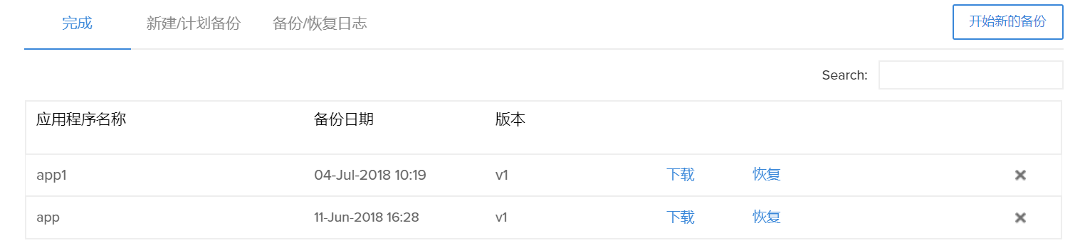 - 应用程序将列示在备份列表页签下,附带备份的版本号和完成日期。