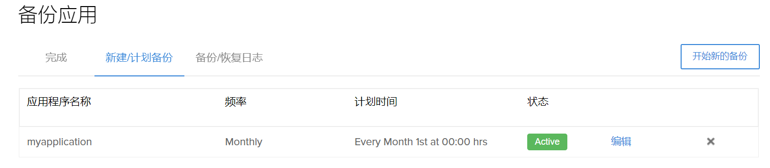 备份计划列表包含根据所配置频率进行的计划备份。可从此处创建新的备份计划、设置备份状态、编辑任何计划备份频率及使用搜索关键字来搜索备份。