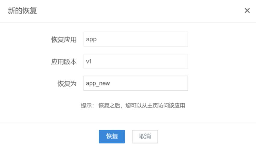 - 从您要恢复的应用程序的备份列表页签中点击恢复。