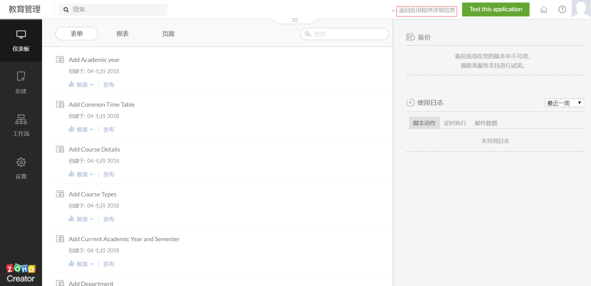 - 点击开发应用以向应用程序添加表单、报告和页面。应用程序仪表盘将在新页签中打开。可在应用程序中添加模块和工作流。请参阅 Creator 帮助以了解有关创建应用程序的更多信息。