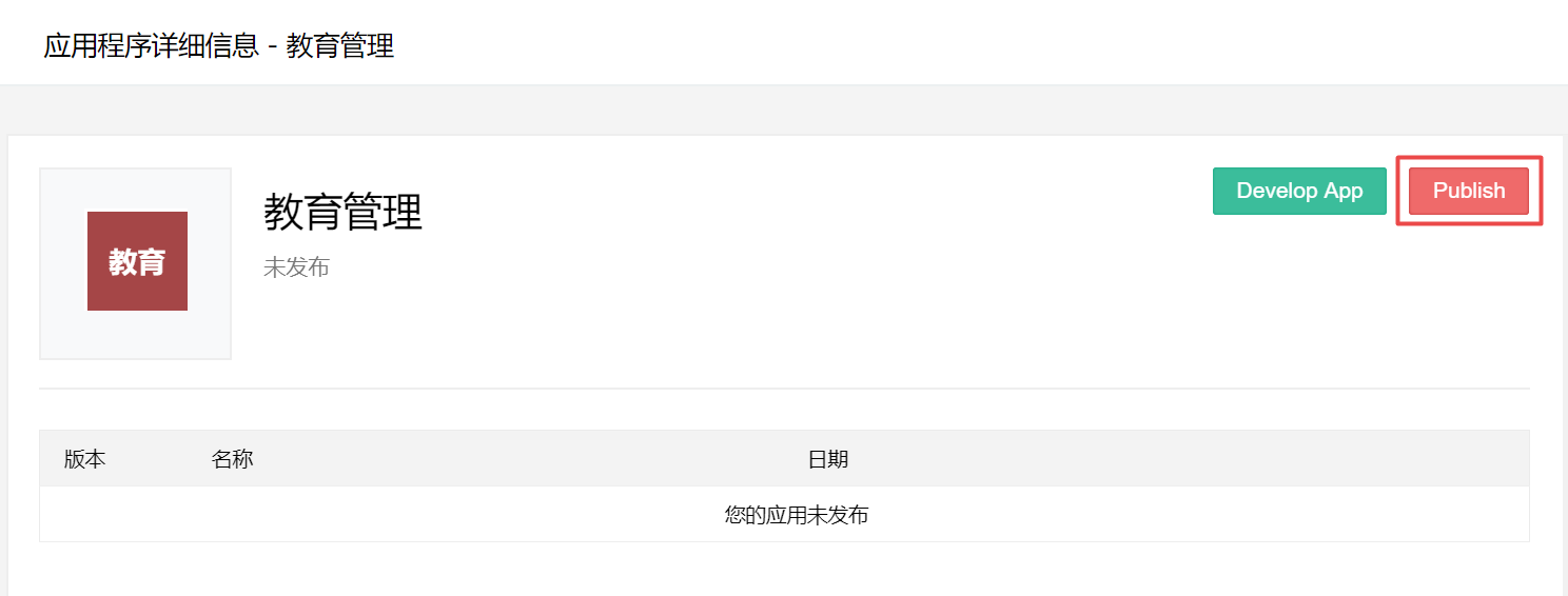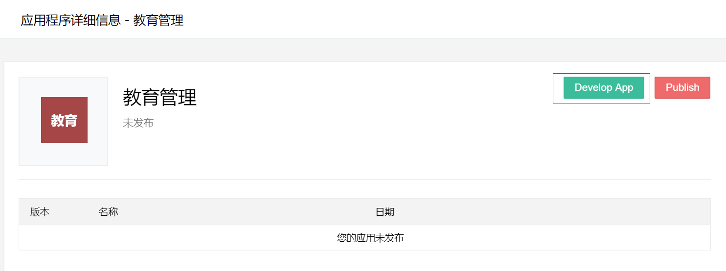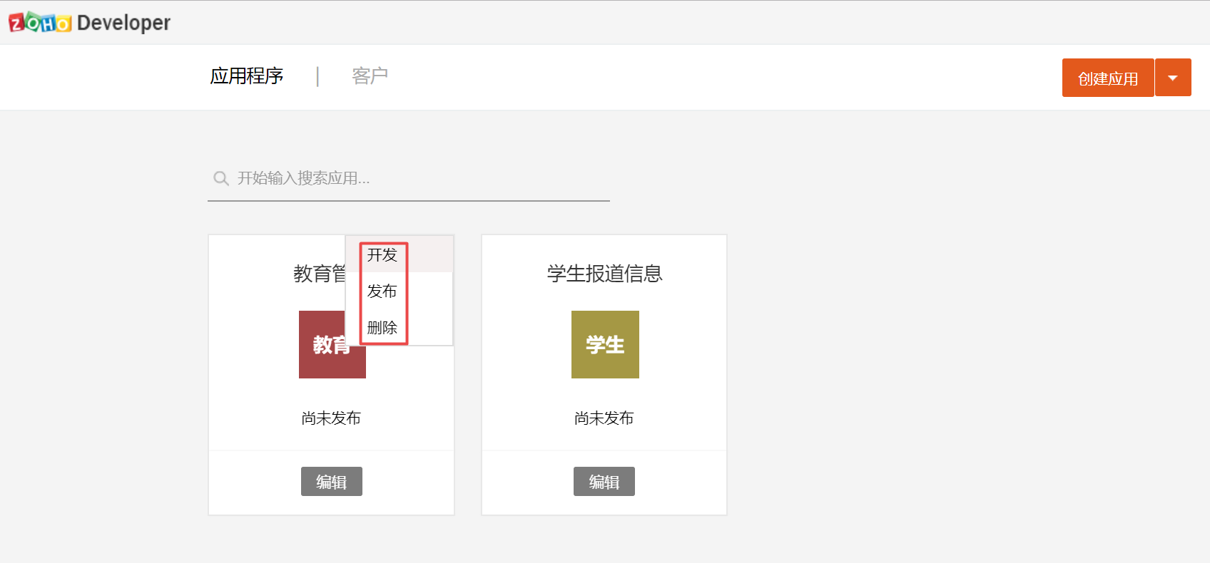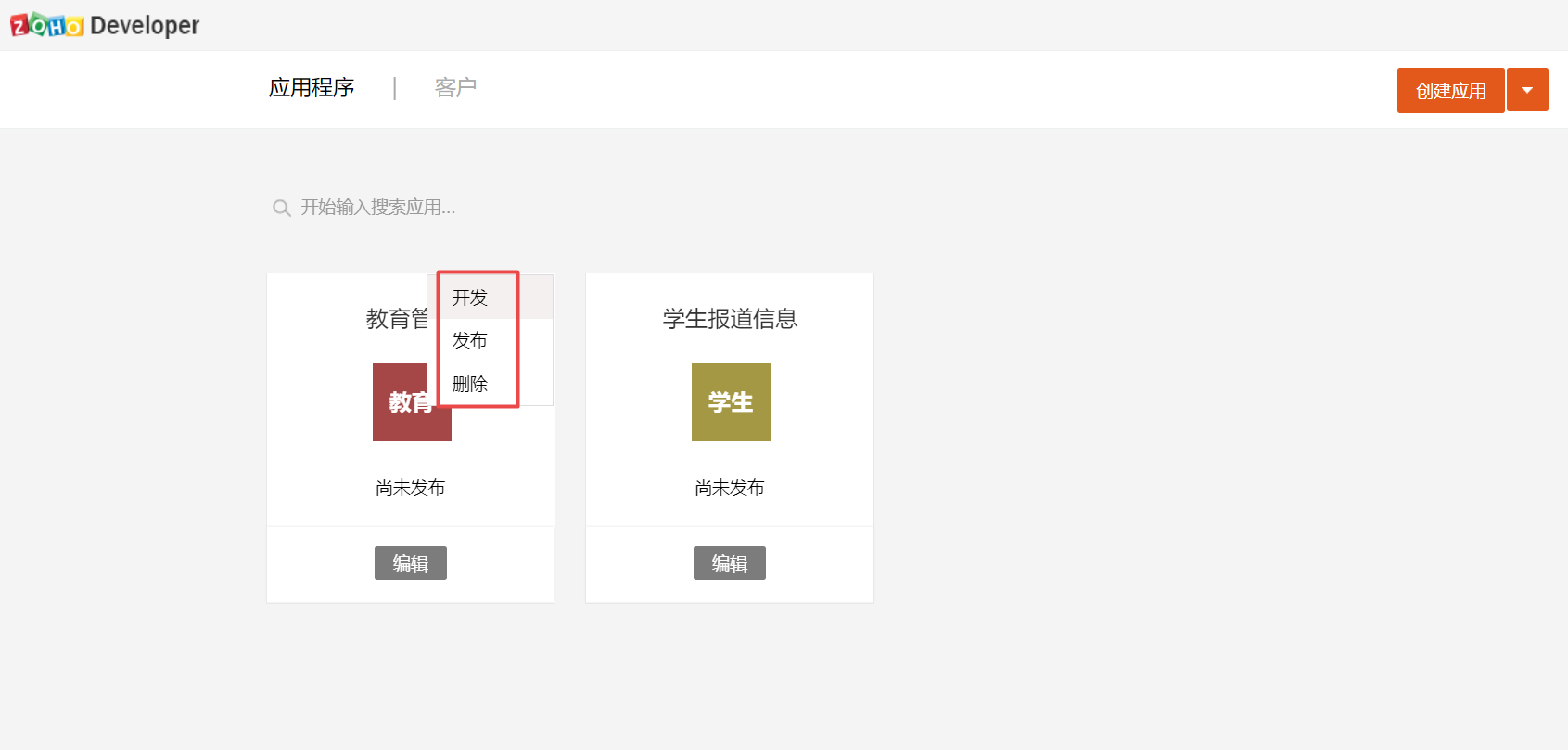 - 在应用程序页面中,将光标放在某个应用程序上,然后点击右上角显示的省略号图标。将显示一个下拉菜单,此菜单包含三个选项:开发、发布和删除。