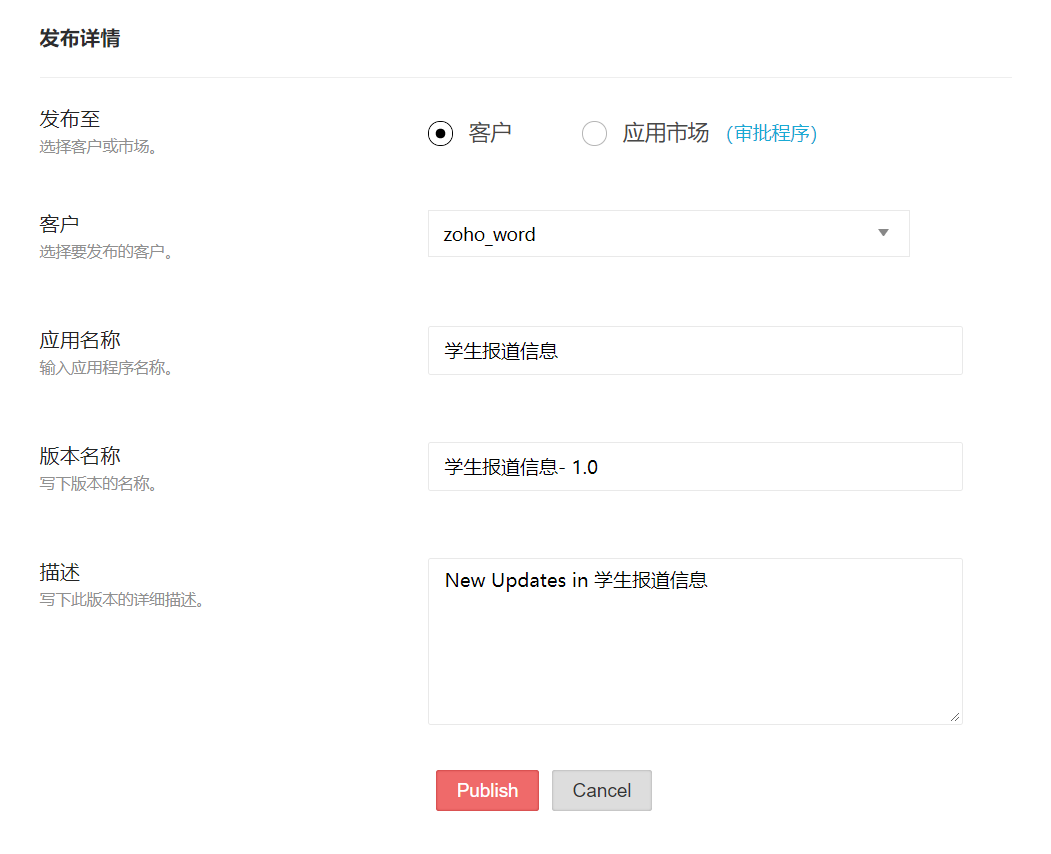 - 客户 - 如果您选择发布至客户帐户,请选择将在其帐户中发布应用程序的客户。