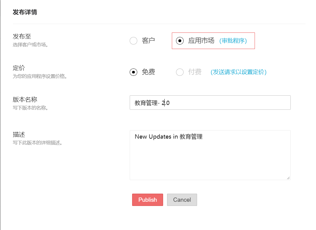 - 发布至 - 选择“应用市场”以在应用市场中发布应用程序。逐步完成将应用发布至应用市场的审批过程。