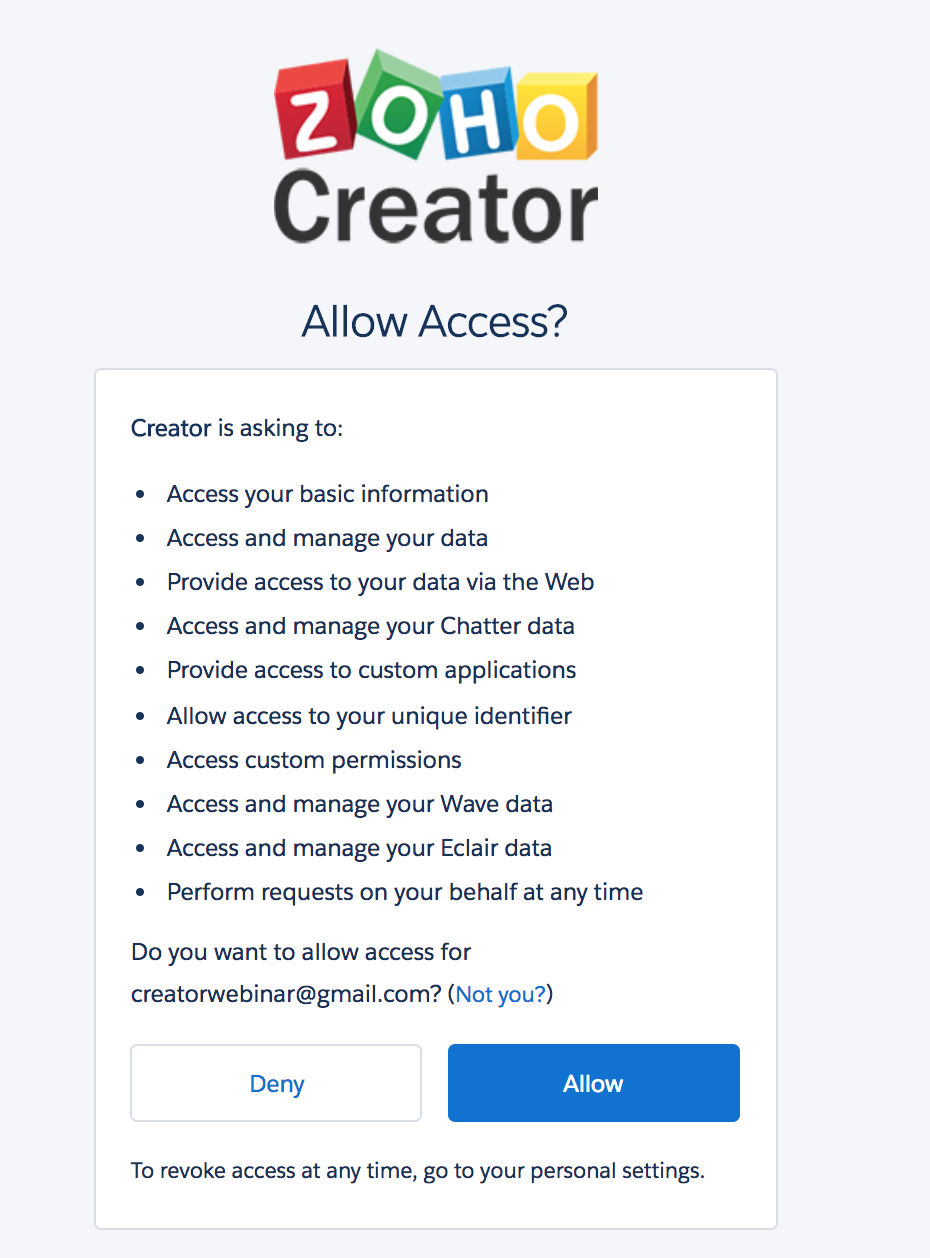 - 点击允许以在 Zoho Creator 与 Salesforce 之间共享应用程序数据。