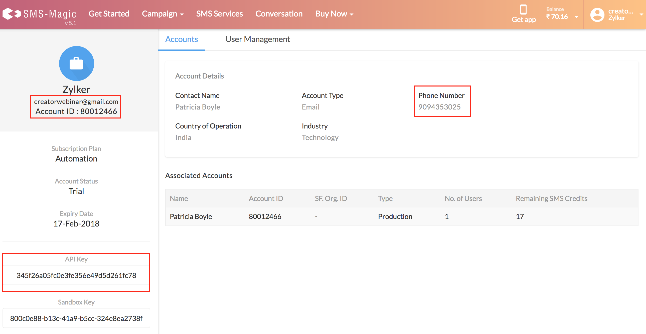 - 复制此页面上显示的邮箱地址(用户名)、帐户 ID、API 密钥和电话号码(发送者 ID)。