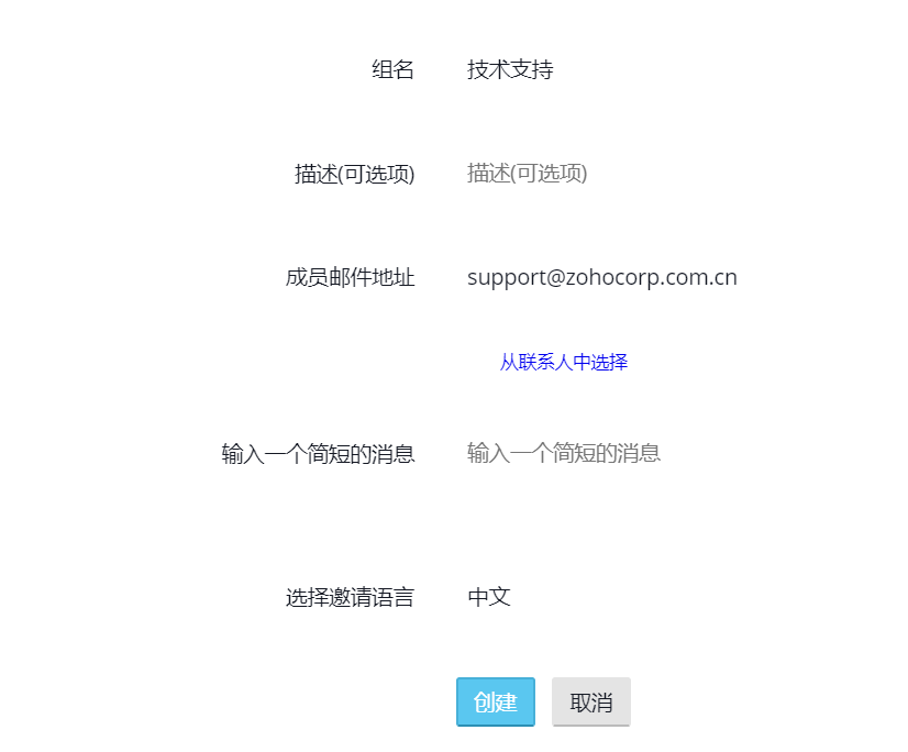 - 成员邮箱地址:输入您想邀请的用户的邮箱地址。可输入邮箱地址,或从 Zoho 联系人列表中选择。