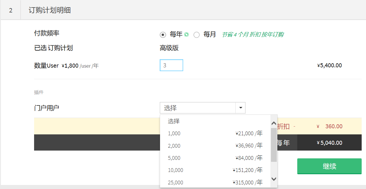 - 版本明细:指定“每年”或“每月”作为“付款频率”。输入您要购买的用户数。门户用户以“附加组件”形式提供,请选择所需数目的门户用户。点击继续。