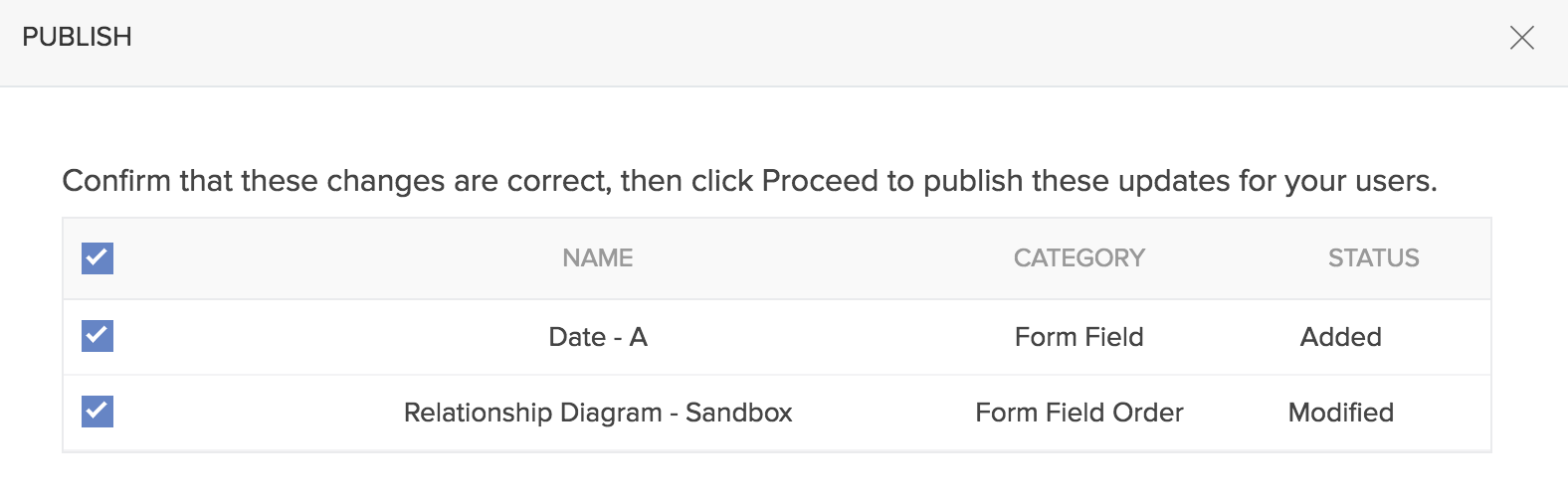 - 您将能够查看在当前沙箱会话中作出的所有应用程序更改。您可以选择想要发布的所需更改。勾选所需的更改并点击继续。