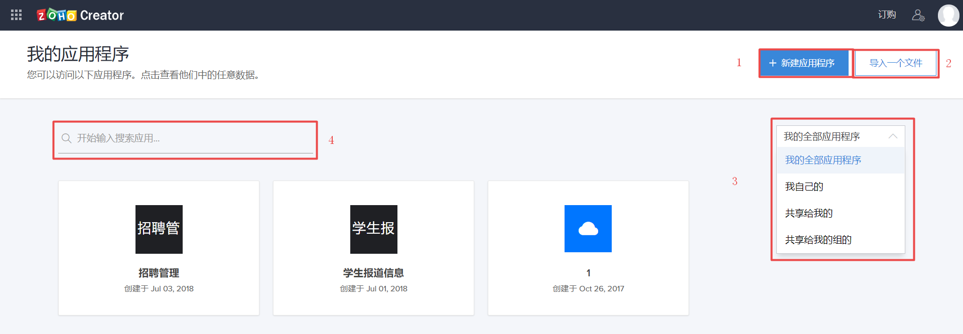 您在登录 Zoho Creator 账户之后看到的第一个页面是我的应用程序页面。此页面包括以下选项: