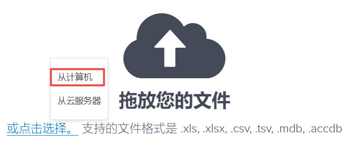 - 选择所需文件,如下所示:受支持的文件格式包括:.xls、.xlsx、.csv、.tsv、.mdb 和 .accdb。