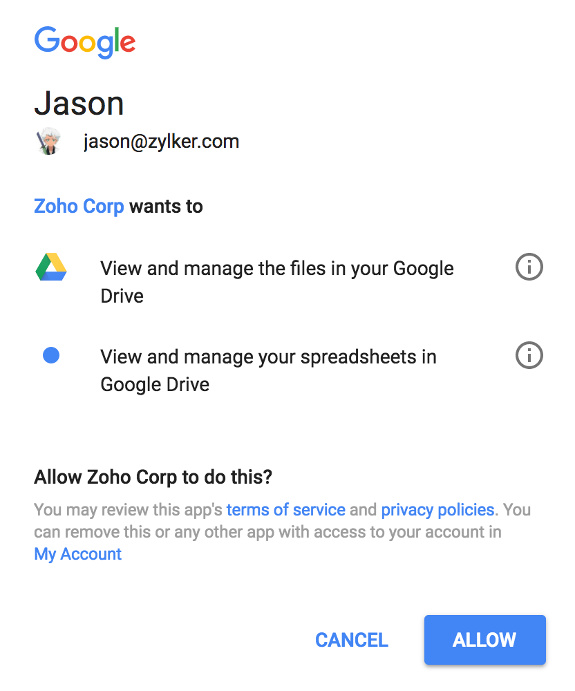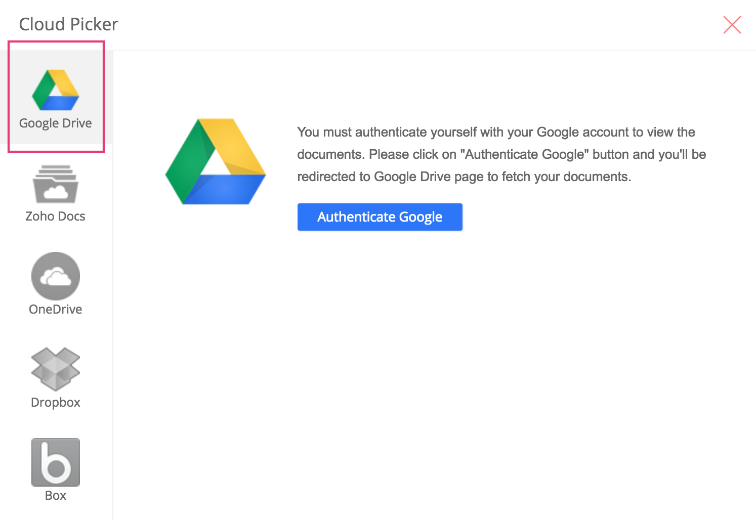 - 点击允许将在云选取器弹出窗口中显示您的 Google Drive 中的文件和文件夹