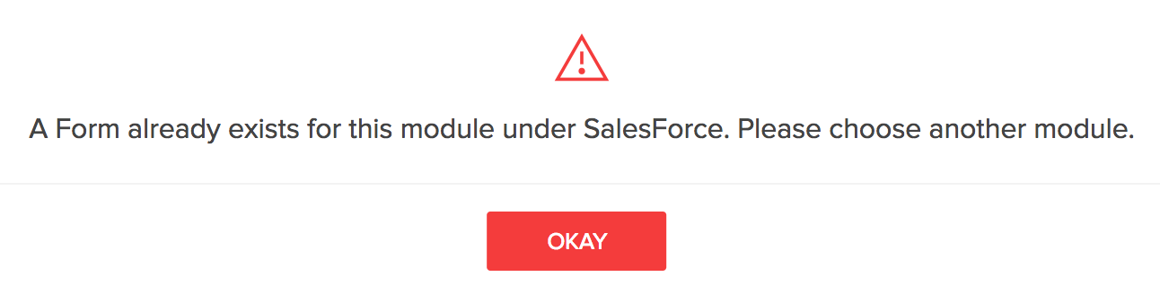 在应用中,您的每个 Salesforce 模块将有一个对应表单。如果您选择已存在对应表单的模块,那么 Zoho Creator 将显示以下提示: