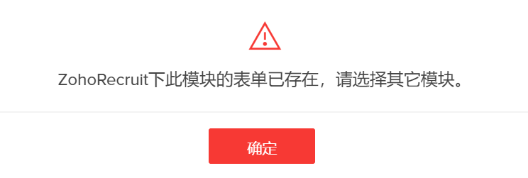 在应用中,您的每个 Zoho Recruit 模块将有一个对应表单。如果您选择已存在对应表单的模块,那么 Zoho Creator 将显示以下提示:
