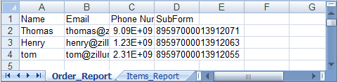 An easy workaround to create this XLS file will be to add a sample record into the Form with SubForm and then export this data in XLS format, as specified in the section Export MainForm data with SubForm. For example, the XLS file generated by exporting MainForm named "Orders" and a SubForm named "Items", will be in the format as explained below.