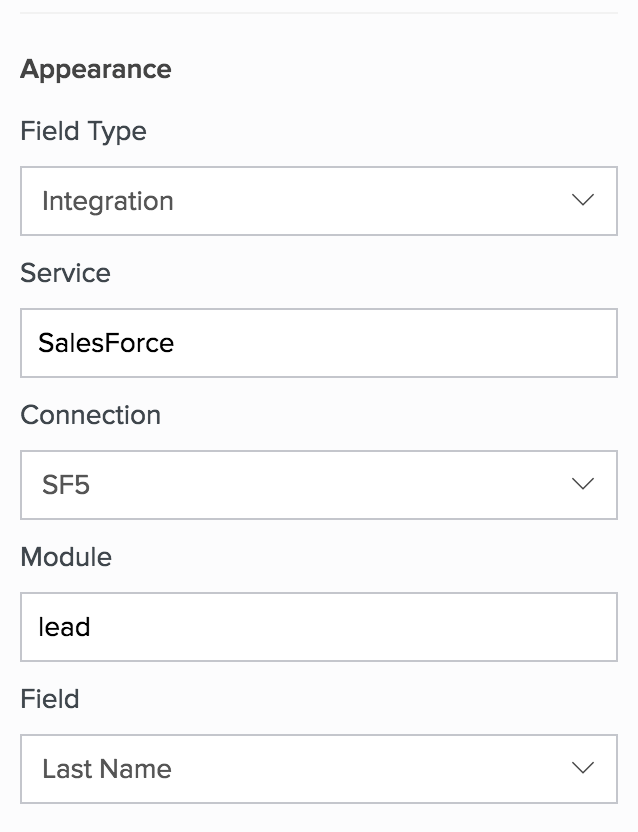 添加 Salesforce 字段后,所选连接、模块和字段将显示在右侧的字段属性 -> 外观分栏中。您将能够: