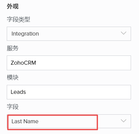 添加 Zoho CRM 字段后,所选模块和字段将显示在右侧的字段属性 -> 外观分栏中。您将能够将字段更改为所选 Zoho CRM 模块中的任何可用字段。