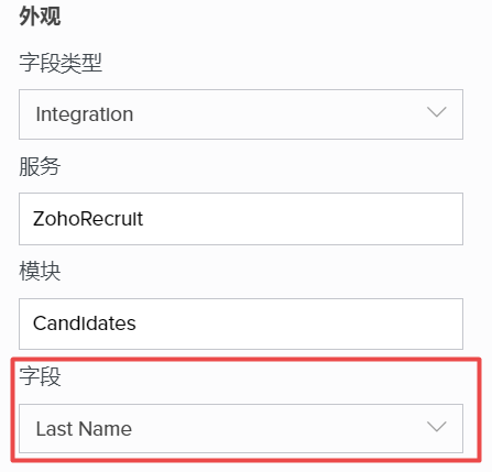 添加 Zoho Recruit 字段后,所选模块和字段将显示在右侧的字段属性 -> 外观分栏中。您将能够将字段更改为所选 Zoho Recruit 模块中的任何可用字段。